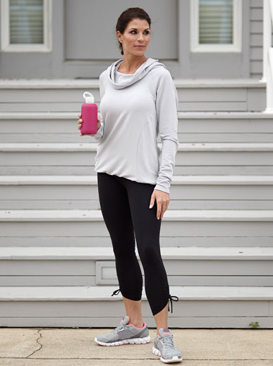 - Double waistband flattens the belly while providing a second lower waistband for added support or additional pocket space